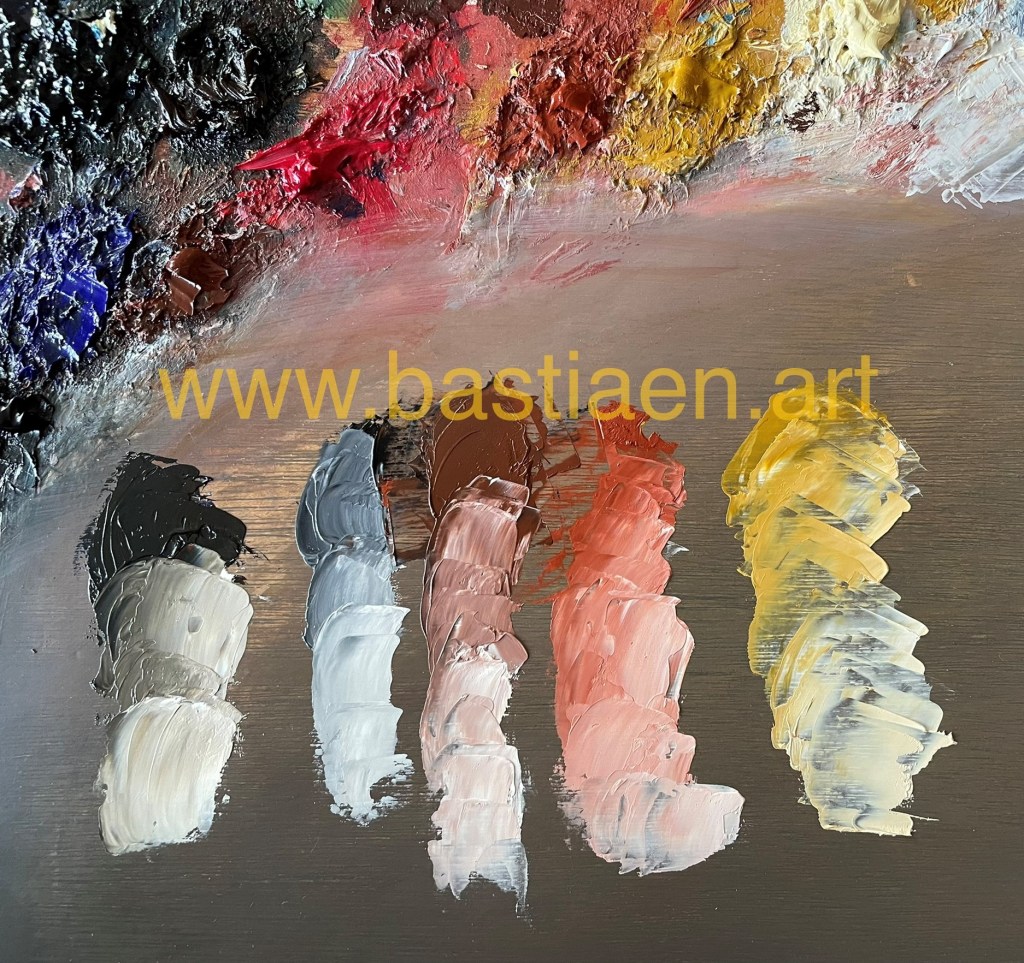 I prefer to work in oil paint. Like many of the ‘old masters’, I first make a background in earth tones. The background color is also part of the painting. I first set the contour with the pencil and then start a design in a ‘dead paint’, namely without color. Then I proceed applying colours layer upon layer with transparent paint strokes from dark to light. I also use glazing as a technique to get even more depth in the work.